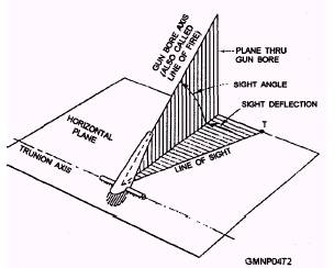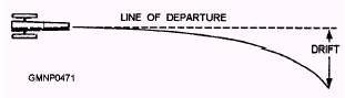 Figure 10-7.-Effect of drift. LINES.- Given the effects of exterior ballistics, two lines are required. One line, called the line of sight (LOS), is used to establish the present location of the target; the second line, called the line of fire (LOF), is used to establish the position of the gun bore with respect to the LOS. The LOS is the primary reference from which the offsets are made to establish the LOF. LEAD ANGLES.- Two lead angles are considered in the fire control problem- sight angle and sight deflection (fig. 10-8). Sight angle is the difference between the LOF and the LOS, measured on the plane perpendicular to the trunnion axis. Sight deflection is the angle that the plane through the gun bore is deflected left or right from the LOS. REFERENCE PLANES.- Reference planes are flat surfaces that may extend in all directions to infinity. Normally, these planes are pictured with boundaries equal to the range of the fire control problem, as shown in figure 10-9. The fire control system establishes target location as a point on a plane using the same three-coordinate system described earlier in this chapter. Once the position, speed, and direction of travel of the target are determined, its future position can be accurately predicted The steps in the solution of the fire control problem can be described as follows: l Determining present target location in relation to own ship l Predicting future target position in relation to own ship . Stabilizing the system