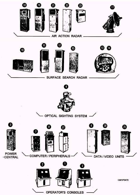 Figure 10-12.-Mk 86 Mod 10 FCS. Operator Consoles The operator consoles consist of the control officer console Mk 67 (COC, unit 1) and two Mk 113 weapons control consoles (WCC1 and WCC2, units 2 and 3). The COC and WCCs are the principal command positions for the Mk 86 FCS. The COC allows the control officer to control and monitor overall operation of the FCS. From this position he initiates radar tracking of targets and assigns weapons to the WCCs. An operator may control one or both guns from either WCC, depending on the weapon assignment made by the COC operator. The WCC operator enters tire control data into the computer through his keyboard and associated controls. This data includes ballistics data, ammunition selection, target data, grid coordinates, and spotting data. The WCC also has a TV monitor for visual surveillance and optical tracking. Power Central Power central (Mk 12, unit 5) is the central power control and distribution point for all units except the AN/SPG-60 radar set, the digital computer, and the digital input/output (I/O) console. Computer/Peripherals The systems computer/peripherals group consists of the AN/UYK-7 computer, the digital I/O console, and the magnetic tape recorder-reproducer. (These units are shown as units 7, 8, and 37, respectively, in fig. 10-12.) DIGITAL COMPUTER AN/UYK-7.- The FCS uses the AN/UYK-7 general-purpose computer set. The program, once loaded into the computer memory, contains all instructions and constant data required to perform the computations and functions related to the fire control problem. The computer performs ballistic computations to determine the line-of-fire of the gun and the time-in-flight of the projectile from which gun orders are generated. DIGITAL I/O CONSOLE.- The digital I/O console consists of a paper tape reader and perforator and a teletypewriter (keyboard/printer). The I/O console is primarily used for troubleshooting and for running system diagnostics. MAGNETIC TAPE RECORDER-REPRODUCER.- The magnetic tape recorderreproducer (MTRR) interfaces with the AN/UYK-7 computer to load the operational and maintenance programs for the system. The MTRR also records all system engagements for future review. |