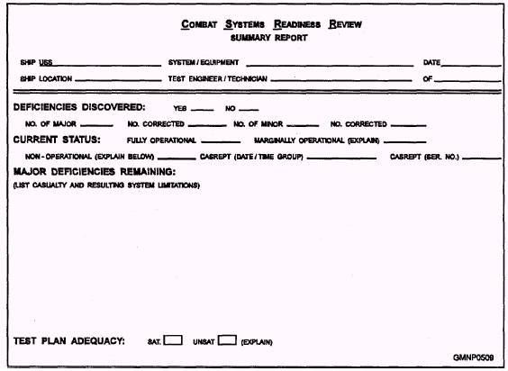 Figure 13-4.-CSRR Summary Report. data base at each FLTCINC site, and follow-up messages are forwarded to the CNO database. As CASREPs are submitted, managers are able to monitor the current status of each outstanding casualty. Through the use of high-speed computers, managers are able to collect data concerning the history of malfunctions and effects on readiness. This data is essential to the maintenance and support of units dispersed throughout the world. Unit commanders should be aware that alerting seniors to their unit's operational limitations, brought about by equipment casualties, is important in expediting receipt of replacement parts and in obtaining technical assistance. Both of these functions of CASREP are necessary to provide the information needed in the realm of command and control of U.S. Navy Forces and to maintain the units in a truly combat ready status. Unit commanders should not delay or withhold reports to maintain the unit's readiness rating artificially at a higher than actual level. Support from every level, including intermediate and unit commanders, is essential to maintaining the highest level of combat readiness throughout the Navy. A "casualty" is defined as an equipment malfunction or deficiency that cannot be connected within 48 hours and falls into one or more of the following categories: 1. Reduce the unit's ability to perform a primary mission. 2. Reduce the unit's ability to perform a secondary mission (casualties affecting secondary mission areas are limited to Casualty Category 2). 3. Reduce a training command's ability to provide a major segment of its program and cannot be corrected relatively quickly by local action alone. TYPES OF CASREPS The CASREP system contains four different types of reports: INITIAL, UPDATE, CORRECT, and CANCEL. These reports of equipment casualties are submitted using a combination of two or more messages, depending on the situation and contributing factors. These four types of reports are described in the following paragraphs,