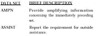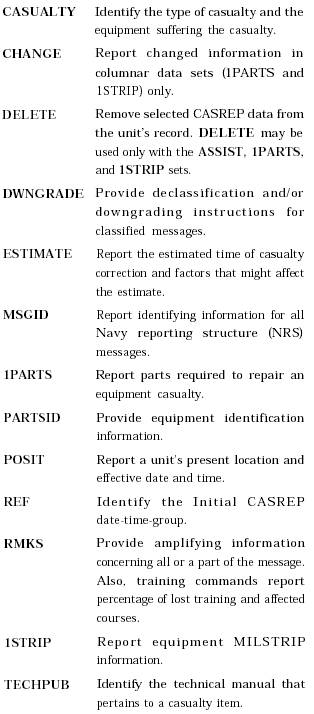 CASREP MESSAGE FORMAT A CASREP message consists of one or more data sets that convey suffiicient information, to satisfy the requirements of a particular casualty reporting situation. These data sets are preceded by a standard Navy message header consisting of precedence, addressees, and classification. Specific guidelines for both the message header and data sets to be used are contained in NWP-10-1-10, Operational Reports. This publication also provides detailed information for typing each kind of casualty report (INITIAL, UPDATE, CORRECT, or CANCEL) with examples of different CASREP situations and how to submit the applicable report for each. A CASREP message will always be serialized. This serialization will be the MSGID (message identification) set, which appears immediately after the message classification line. The serial numbers are sequential from 1 through 999 for every CASREP originated by a unit. These serial numbers should never be repeated until a new sequence of 1 through 999 has begun. Anew sequence of numbers starts after the unit has submitted CASREP message number 999. The date-time-group (DTG) of the message transmission is the effective time ("as of" time) of the CASREP. Follow-up CASREP messages (UPDATE, CORRECT, or CANCEL) should reference the INITIAL CASREP message DTG. Because of the importance and priority of CASREP message transmission, these messages should be transmitted even under communications MINIMIZE conditions. The standard naval telecommunications systems (NTS) service procedures are used in correcting any messages having transmission errors. Refer again to the example messages shown in figures 13-5 through 13-9. Notice that many data sets (such as MSGID, POSIT, and REF) are used in the CASREP messages. The following is a list of authorized data sets as they are used in submitting CASREP messages:
