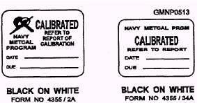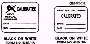 Equipment Calibration Status The Navy calibration program has a series of distinctive labels and tags for indicating the calibration or serviceability status of all Navy test and measuring equipment. All calibration personnel and equipment users should be familiar with each label and tag and its meaning. Labels of different nomenclature, color combinations, and shapes have been designed to help users identify the calibration status. These labels and tags should be used by all participants in the Navy METCAL Program and should be affixed to all Navy standards and test/measuring equipment. NAVAIR 17-35MTL-1/NAVELEX 0969-LP-133-2101/ NAVSEA OD 45845, Metrology Requirements List (METRL), lists Navy calibration procedures and intervals for all laboratory standards and test/measuring equipment. Only equipment actually used for quantitative measurements requires calibration. The lettering Department of the Navy Metrology and Calibration (METCAL) Program (NAVELEX Instruction 4355.2) permits the custodians of test and measuring equipment to obtain and affix CALIBRATION NOT REQUIRED and INACTIVE labels to test/measuring equipment. The METRL also identifies test and measuring equipments that are known to require calibration. Assistance in identifying other test/measuring equipment in this category is available from the respective METCAL group, from the systems commands' designated representatives, or from the Metrology Engineering Center (MEC). Examples of all labels and tags used m the METCAL Program are described and illustrated in the following paragraphs. CALIBRATED.- The CALIBRATED label (fig. 13-13, black lettering with a white background) comes in two different sizes and is the most commonly used