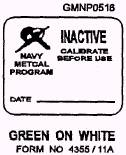 Figure 13-17.-INACTIVE label. with a white background) to the instrument. The INACTIVE label remains on the instrument until it is recalibrated. The instrument should not be used while it is bearing an INACTIVE label. The inactivation of test equipment occurs most commonly when a ship is in an overhaul status and the test equipment has been removed from the ship and stored in an environmentally safe location. CALIBRATION NOT REQUIRED.- Standards and test/measuring instruments not requiring calibration are shown as NCR in the Metrology Requirements List (METRL). The CALIBRATION NOT REQUIRED label (fig. 13-18, orange letters with a white background) is affixed on the instrument and should remain there indefinitely unless its calibration requirements are changed. If an instrument is not listed in the METRL, you should use the following criteria (as listed in the METRL) to decide if the instrument should be placed in the CALIBRATION NOT REQUIRED CATEGORY: The instrument does not make quantitative measurements nor does it provide quantified outputs. The instrument is "fail-safe" in that any operation beyond the specified tolerances will be apparent to the user. All measurement circuits are monitored during use by calibrated instruments or are dependent on external known or calibrated sources of performance within required limits. When you determine that an instrument falls into the CALIBRATION NOT REQUIRED category, you should annotate the label as to the authority for the decision, such as METRL, the applicable technical manual, and letters or messages from higher authority. REJECTED.- If an instrument fails to meet the acceptance criteria during calibration and cannot be adequately repaired, a REJECTED label (fig. 13-19, black letters with a red background) is placed on the
