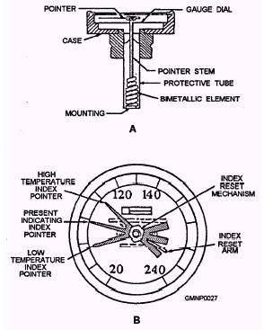 Magazine Temperatures The main purpose of a daily magazine inspection is to check and record space temperatures. If you recall, temperature is the single most important factor that affects powder and propellant stability. Temperature readings normally are taken once a day. The exact time may vary, but most ships take the readings in the morning (around 0800, for example). A special maximum and minimum thermometer is used. (Sometimes it's called a high-low thermometer.) Figure 2-12 illustrates a typical maximum and minimum thermometer. Every magazine or locker will have at least one such direct-reading thermometer. It will be located where maximum space temperature variations will normally occur. It must be installed so it is readily accessible for taking readings and resetting the index pointers. Special brackets are available to mount the thermometer where accidental damage can be prevented. View A of figure 2-12 shows the internal components of the device. The temperature-sensitive element is a single-helix low-mass coil. The coil fits closely inside the thermometer stem. The bimetal element is carefully sized and aged for lifetime stability. The element is covered with a fluid to assure good heat transfer. The fluid also permits maximum speed of response and reduces pointer oscillations caused by