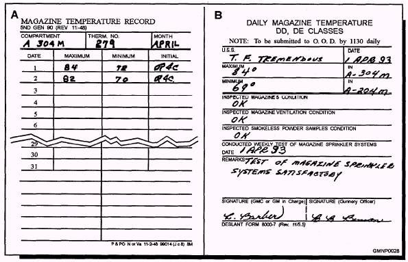 Figure 2-13.-A. The magazine temperature record; B. Daily magazine temperature report. magazine temperature record. 3-M Systems records may also be considered as records of magazine inspection. The magazine temperature record is a card posted in each magazine. Every day you enter the maximum and minimum temperatures recorded for the previous 24 hours in that magazine. The card is replaced every month, and the old one is turned over to the weapons officer. The daily magazine temperature report summarizes the results of magazine inspections for the whole ship. This form includes not only spaces for entering the highest and lowest magazine temperatures but also for reporting the condition of the magazines and their ventilating devices, and (under Remarks) for miscellaneous nondaily routine work. The daily magazine temperatures are transferred from the record cards to a magazine log that is a permanent record of all magazine temperatures. A separate section of the magazine log should be set aside to record the results of the monthly sprinkler system tests. Magazines are considered to be in satisfactory condition if inspection shows the space meets the requirements listed on applicable MRCs. Daily inspection requirements usually include checking the general condition and cleanliness of the space. Less frequent inspections (monthly, quarterly, and so on) normally direct a more detailed check of specific magazine conditions and equipment. Each 3-M inspection requirement should be completely understood and followed to the letter. Doing so not only ensures a safe ammunition storage area but also fulfills the requirements of periodic inspections, such as the explosive safety inspection (ESI). ESI inspectors use the same inspection criteria as are found on your MRCs. |