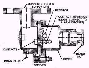 diaphragm. In both instances a differential pressure is created to trip the PRP valve. A differential pressure of at least 8 ounces psi across the release diaphragm is necessary to trip the PRP valve. NOTE The gauge mounted on the front of the PRP valve indicates the pressure within the entire system-not the differential pressure. At times the gauge may indicate a positive pressure within the system. This pressure is a normal condition caused by expansion of air within the system as a result of increased ambient temperature. The pressure indicated on the gauge exists on both sides of the PRP valve release diaphragm. For a complete operating description of all the different magazine sprinkler system configurations, refer to Magazine Sprinkler Systems, NAVSEA S9522-AA-HBK-010. MAGAZINE ALARM SYSTEM Several types of warning devices or systems are used on board ship. One of them is the alarm system activated by the water switch (fig. 2-24) on the dry side of the sprinkler system main (group) control valves. This alarm is designated FH and indicates by sound or by light when the main control valve is open or leaking. Another type of alarm is the flooding alarm, designated FD, that incorporates a float switch located near the deck. As water accumulates on the deck, the float rises, making a set of contacts and sounding an alarm. It is worth considering that, in the event the sprinkler system is actually activated, both alarms would sound within seconds of each other. Remembering this fact will help