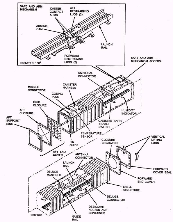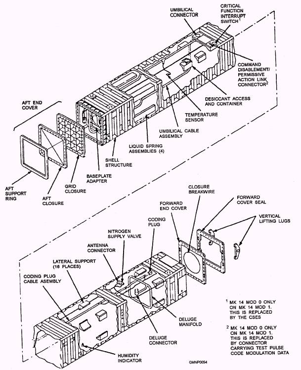 Figure 2-39.-Mk 14 Mods 0 & 1 canisters. missile, arm, and ignite the Dual-Thrust Rocket Motor. A canister access port with a removable cover allows the use of a safe only tool to return the S&A mechanism to the safe position. MK 14 MODS 0 & 1 VLS CANISTERS.- The Mk 14 Mods 0 & 1 canisters provide environmental protection, structural and alignment support of the Tomahawk All-Up-Round (AUR) (fig. 2-39). The AUR consists of a missile and booster sealed in a canister that is nitrogen charged to provide additional environmental protection. The shell structure contains a thermal protective lining to reduce structural temperature during launch. The Mk 14 Mod 1 canister uses a CSES for conventional Tomahawk missiles. The Mk 14 Mod 0 canister uses a Critical Function Interrupt Switch (CFIS) which is similar in function to a CSES, with the exception being that it is key operated to prevent the inadvertent selection and launch of a nuclear missile. A Command Disablement/Permissive Action Link (CD/PAL) connector allows access to the nuclear warhead to unlock the warhead for use. |
