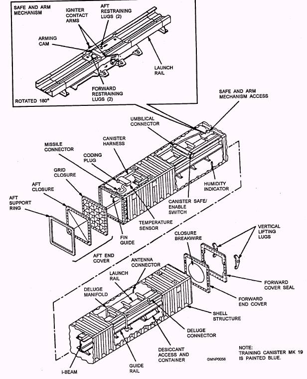 Figure 2-41.-Mk 19 Mod 0 canister. MK 19 MOD 0 VLS CANISTER- The Mk 19 Mod 0 canister is used for missile strikedown training (fig. 2-41). The Mk 19 canister is painted blue, rather than the normal white, and stenciled with the word "TRAINING." The canister contains a weighted and balancedbeamto simulate a Mk 13 Mod 0 canister. One canister is carried onboard all VLS ships. MK 21 MOD 0 VLS CANISTER- The Mk 21 Mod 0 canister houses the SM-2 Block IV, extended range (ER) surface-to-air-missile (SAM) (fig. 2-42). Unlike other canisters, this is a single use canister. Dorsal fin flyout guides, booster guide rails, and booster guide cradles provide alignment for the missile during launch. A longitudinal restraint clamp is held secure to the booster until missile launch.