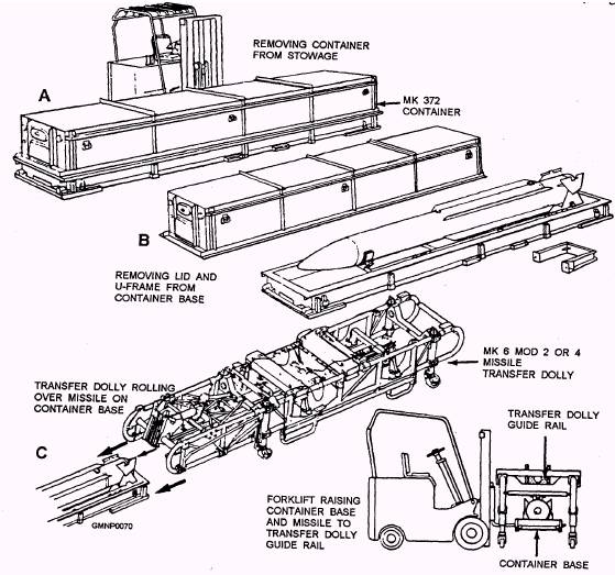 Handling Operations Now that you have some background information on various containers and handling equipments, let's put it to use. The next three figures in the text illustrate certain basic handling operations for Mk 13 Mod 4 and Mk 26 GMLS class ships. Refer to them frequently as we describe the major events. Take special note of the equipments being used Also, use a bit of imagination and remember the versatility of these items. NOTE Certain key steps or events have purposely been omitted from the general descriptions that follow. TARTAR HANDLING-CONTAINER TO DOLLY.- Figure 2-55 shows a typical Standard In this case, the missile is transferred directly from its container onto a dolly. View A shows a forklift truck moving a Mk 372 container to a designated handling area. Note that the forklift tines are lowered and the container rides near ground level. This orientation is the safe way, considering center of gravity and counterbalance factors. The forklift will deposit the container on a flat, even surface (either on a pier or A.E-type ship's deck). View B shows the container being prepared. The lid is unlatched lifted from the base, and hand-carried from the immediate loading area. That makes room for upcoming forklift and dolly movements. The center missile support (U-frame) is removed. The lower missile shoes are unlocked from the inner support assembly of the container. In view C, a Mk 6 Mod 2 or 4 dolly has been brought into position behind the container. When the dolly is aligned to the container, its wheeIs are locked (straight).