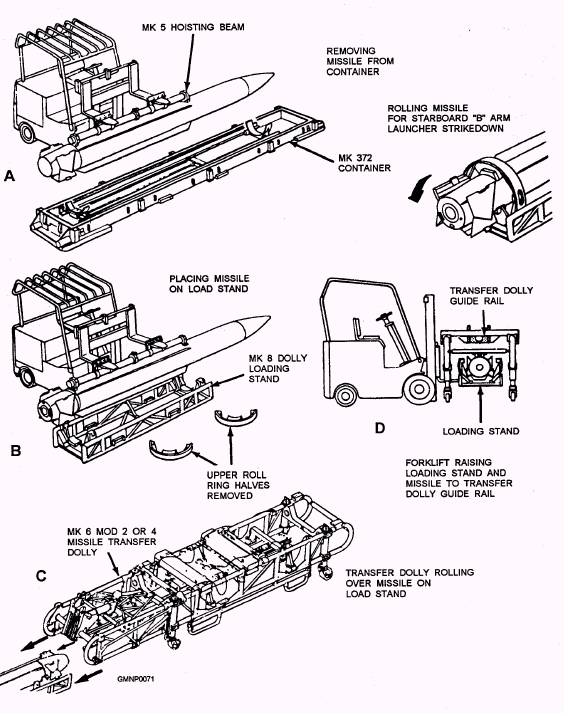 Figure 2-56.-A Standard MR missile handling sequence; container to loading stand to dolly roll. The most common underway-connected replenishment (UNREP-CONREP) method for missile transfer today is called STREAM. STREAM stands for standard tensioned replenishment alongside method. It is used to transfer a variety of missile, ammunition, and other cargo loads. Figure 2-57 illustrates the basic arrangement for a STREAM rig. After the various lines are connected, the sending ship controls all operations. In the figure, the receiving ship is using a sliding pad eye. As the load reaches the receiving ship, the pad eye is lowered. This lowering places the transfer dolly on deck at the replenishment station. The sling of the dolly is disconnected from the cargo hook. The handling crew moves the dolly to the GMLS's strikedown area. Strikedown operations are performed and the empty dolly is returned to the replenishment station. Additional information about CONREP procedures can be found in Naval Warfare Publication (NWP) 14, Replenishment at Sea. Another good (and available) source is Boatswain's Mate, volume 2, NAVEDTRA 12102 A vertical replenishment (VERTREP) is a very efficient and versatile replenishing method. A helicopter (helo) is used to transfer just about anything anywhere. Ammunition, cargo, and personnel loads can be transported between ships, ship-to-shore, or shore-to-ship. The only limiting factors to a helo operation are the range and capacity of the helo, and the weather. If the receiving ship is equipped with the proper (and required) lighting, nighttime operations are possible. However, most VERTREP ammunition transfers are conducted during daylight hours (for safety considerations). During a missile transfer, the helo supports the load (a transfer dolly or container) on a cable/sling arrangement. As the helo approaches the receiving ship, the pilot maneuvers over the "drop" zone of the ship. A landing signalman (usually one of the ships BMs) guides the helo in with a series of hand signals. When the load is over the drop zone, the helo lowers and puts the dolly/container on deck A hookup man (another ships BM) runs to the load and disconnects the helo's hook. The helo rises and clears the area. When the helo is at a safe distance from the ship, the missile-handling team assembles. The team moves