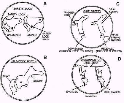 Figure 3-7.-Safeties on the .45-cal. pistol. compressing it. When the slide strikes the recoil spring guide collar, its rearward movement is stopped. The recoil spring then causes the slide to begin its forward movement. The hammer follows the slide for a short distance. Then the sear, which bears against the hammer through the action of the sear spring, enters the full-cock notch of the hammer and holds it in a cocked position. Feeding starts as soon as the slide, moving to the rear, clears the top of the magazine. The magazine follower, under pressure from the magazine spring, forces the top round against the lips of the magazine. This places the top cartridge in position to be picked up by the face of the slide during its forward movement. Cambering occurs when the forward moving slide pushes a new round into the chamber. As the bullet is pushed up the ramp into the chamber, the base of the cartridge slides up the face of the slide. As this happens the groove on the base of the cartridge is engaged by the hooked extractor. After cambering, the slide continues forward a small distance, pushing the barrel ahead of it. As the barrel moves, it pivots up and forward on the barrel link. The locking ribs on the barrel enter the locking recesses in the slide, thereby locking the two together. Firing will start the cycle all over again. When the grip safety is depressed and the trigger is squeezed, the trigger yoke presses against the disconnector, which pushes aft on the sear. The sear rotates on its pin, disengaging from the notch on the hammer. The mainspring pushes up on the hammers strut, roataing the hammer forward. The hammer strikes the firing pin which, in turn, strikes the cartridge primer. For more information on the M1911A1 .45-cal. pistol, refer to U.S. Army TM 9-1005-211-12. |