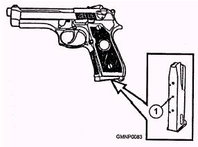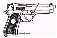 Figure 3-8.-9-mm M9 semiautomatic pistol. movement. The slide then extracts and ejects the fired cartridge case, cocks the hammer, and compresses the recoil spring. The slide moves forward, stripping the next cartridge from the magazine, and feeds it into the chamber. After the last cartridge has been fired and ejected, the slide and barrel assembly will remain open by the magazine follower pressing up on the slide stop lever. Disassembly Disassembly of the M9 is to be conducted according to the current 3-M Systems MRCs. Detailed disassembly is not normally conducted by