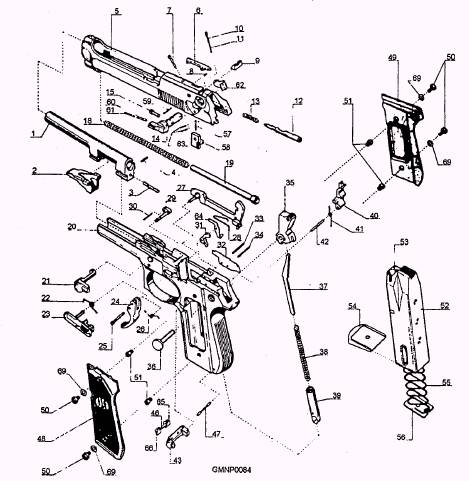 | Part # Nomenclature | Part # Nomenclature | | Barrel (Factory FittingRequired) | 34 Ejector Spring Pin | | Locking Block | 35 Hammer | | Locking Block Plunger | 36 Hammer Pin | | Locking Block Plunger -Retaining Pin | 37 Hammer Spring Guide | | Slide (Factory FittingRequired) | 38 Hammer Spring | | Extracto r | 39 Hammer Spring Cap | | Extractor Pin | 40 Sear | | Extractor Spring | 41 Sear Spring | | Rear Sight (Fitting Required) | 42 Sear Pin | | Trigger Bar Release Plunger | 43 Magazine Release | | 11 Trigger Bar Release PlungerSpring | 46 Magazine ReleaseButtonSpring | | 12 Firing Pin | 47 Hammer Spring Cap Pin | | 13 Firing Pin Spring | 48/49P Grips (Plastic) Pai r | | 14 Safety | 48/49W Grips (Wood) Pair | | 15 Firing Pin Plunger | 50 Grip Screw | | 18 Recoil Spring | 51 Grip Bush | | 19 Recoil Spring Guide | 52 Magazine Box | | 20 Frame | 53 Magazine Follower | | 21 Disassembling Latch | 54 Magazine Bottom | | 22 Slide Catch Spring | 55 Magazine Spring | | 23 Slide Catch | 56 Magazine Lock Plate | | 24 Trigge r | 57 Firing Pin Catch Spring | | 25 Trigger Pin | 58 Firing Pin Catch | | 26 Trigger Spring | 59 Firing Pin CatchRetainingSpring Pin | | 27 Trigger Bar | 60 Safety Plunger Spring | | 28 Trigger Bar Spring | 61 Safety Plunger | | 29 Disassembling Latch ReleaseButton | 62 Right Safety Lever | | 30 Disassembling Latch ReleaseButton | 63 Right Safety LeverSpring Pin | | 31 Hammer Release Lever | 64 Firing Pin Catch Lever | | 32 Ejecto r | 65 Magazine Catch SpringBush(Short) | | 33 Hammer Release Lever Pin | 66 Magazine Catch SpringBush(Long) | | | 69 Spring Washer |