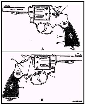 Figure 3-18.-.38-cal. special Smith and Wesson revolver: A. Left side-(1) thumbpiece (cylinder release), (2) stock screw, (3) stock, B. Right side-(1 and 2) side-plate screws, (3) side plate, (4) stock. action also rotates the cylinder. The hammer is held in the cocked position by the sear until released by the trigger. In double-action firing, pulling the trigger causes the hammer to be raised to nearly its full-cock position. The hammer strut will then escape the trigger, and the spring-loaded hammer will fall and strike the cartridge. In double-action firing, the cylinder is rotated by pulling the trigger. Since it requires considerably less trigger pull for single action, this method should produce better accuracy. The empty cartridges are ejected by swinging out the cylinder to the left and pushing the ejector plunger toward the rear of the cylinder. There are two built-in safeties on this revolver-the hammer block and the rebound slide. 'The hammer block prevents the hammer from going far enough forward to strike the cartridge primer when both the hammer and the trigger are in the forward or uncocked position. Thus, if the revolver were dropped or otherwise struck on the hammer, the round would not be freed. The rebound slide actuates the hammer block to prevent the hammer from traveling far enough to strike the primer should the hammer slip from the thumb while being manully cocked.