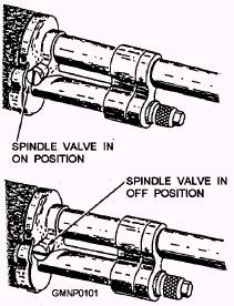 Figure 3-27.-Gas spindle valve in the ON and OFF positions. 1. Position the selector for automatic free. 2. Push the safety forward. 3. Squeeze the trigger. The rifle will fire automatically as long as the trigger is squeezed and there is ammunition in the magazine. Release the trigger to cease firing. 4. After the last round is fired, the magazine follower (a spring-driven plate in the magazine that forces cartridges upward as rounds are expended and cases ejected) actuates the bolt lock, locking the bolt in the rearward position. When an empty magazine is removed and a loaded one inserted, release the bolt lock by retracting the operating rod, thereby drawing the bolt rearward, then close the bolt. As the bolt assembly is closed, the top cartridge in the magazine is pushed forward into the chamber. Unloading the M14 Rifle To unload the M14 rifle, proceed as follows: 1. Push the safety to the SAFE (back) position. 2. Grasp the magazine with your thumb on the magazine latch, and squeeze the latch to release it. Push the magazine forward and downward to disengage it from the front catch, and then remove it from the magazine well, as shown in the right-hand view of figure 3-24. 3. Pull the operating rod handle all the way to the rear and lock it, using the bolt catch. 4. Inspect the chamber to make sure it is clear. The rifle is clear only when no round is in the chamber, the magazine is out, the safety is set (to the rear), and the bolt is in the REAR position. Field Stripping the M14 Rifle Figure 3-28 shows how the M14 rifle breaks down into seven group assemblies. You should be able to disassemble the rifle to this extent for cleaning, lubrication, and maintenance. This procedure is called field stripping the rifle. The names of the numbered group assemblies shown in figure 3-28 areas follows: 1. Magazine 2. Firing mechanism 3. Stock with butt plate assembly 4. Handguard assembly 5. Operating rod and connector group
