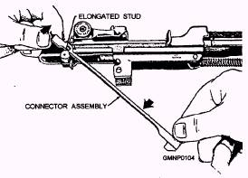 Figure 3-30.-Removing the connector assembly. 4. Rotate the connector assembly about 35 degrees clockwise until the slot at the rear is aligned with the elongated stud on the sear release (fig. 3-30); then lower the front end of the connector assembly and lift it off the sear release. The next step is to remove the operating rod spring guide, the operating rod spring, and the operating rod. These parts are identified as 2, 3, and 4, respectively, in figure 3-31. The correct step-by-step procedure is as follows: 1. with the barrel and receiver group upside down, pull forward on the operating rod spring, relieving pressure on the connector lockpin. Pull the lock outward to disconnect the operating rod spring guide. 2. Remove the operating rod spring guide and the operating rod spring. Turn the barrel and the receiver group right side up. 3. Retract the operating rod until the key on its lower surface coincides with the notch in the receiver.