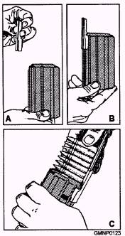 Loading the Magazine Magazines are available with a capacity of 20 or 30 rounds and may be loaded with any amount up to that capacity. 'he magazine follower has a raised portion generally resembling the outline of a cartridge. Cartridges are loaded into the magazine so that the tips of the bullets point in the same direction as the raised portion of the follower (fig. 3-48). A magazine charger and magazine charger strip (fig. 3-49) are provided to facilitate loading of the magazine.