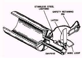 MK 87 MOD 1 LINE-THROWING RIFLE ADAPTER KIT LEARNING OBJECTIVE Discuss the Mk 87 Mod 1 line-throwing kit and describe what is needed in preparation for firing. This kit redates the Mk 87 Mod O kit that replaced the 45/70 line-throwing gun. Included in the kit are 6 projectiles, 1 launcher,18 chemical light wands, and 1 recoil pad. The line-throwing assembly (launcher, projectile, and canister) is designed to be used with the M14 and Ml 6A1 rifles and applicable grenade cartridges (M64 and M195, respectively). LAUNCHER The launcher (fig. 3-56) is used to hold the projectile and trap propellant gases that propel the projectile. It consists of a cylindrical steel tube approximately 8.5 inches long and 2.75 inches in diameter at the launching end and 1 inch in diameter at the connecting end. When the launcher is used with the M14 rifle, it slides over the flash suppressor and is secured to the rifle by the latch and its wire loop that fits over the bayonet lug of the rifle. The safety retaining pin, fastened to the launcher by a stainless steel lanyard, fits through the latch to lock the launcher to the rifle. The connecting end of the launcher is threaded internally to accept the M16A1 rifle barrel after the flash suppressor of the rifle is removed. PROJECTILE The projectile (fig. 3-57) fits into the launcher. When the rifle grenade cartridge is fired, the projectile