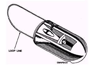 Figure 3-57.-Projectile. carries one end of the attached shot line tome desired destination. 'he projectile also houses the chemical light wands for night operation. The reusable projectile is made of butyl rubber with a stainless steel disk assembled in the base end. The disk absorbs the impact of the propellant gases and the wadding of the rifle grenade cartridge. The hole and groove shown in figure 3-57 support the light wand. Three of these supports, located 120 inches apart, are contained in each projectile. The loop line is used to connect the shot line to the projectile. |