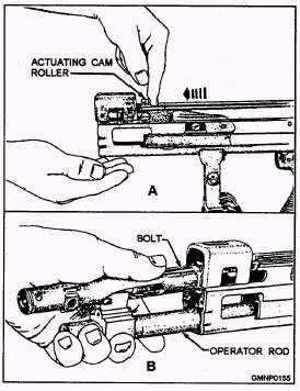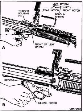 REMOVING THE TRIGGER MECHANISM GROUP.- The trigger mechanism grip group consists of the trigger mechanism grip assembly (trigger housing, sear, sear pin, sear plunger, sear plunger spring, trigger pin, and trigger), the trigger housing pin (interchangeable with the sear pin), and the leaf spring. To remove the group, press in on the front of the leaf spring and rotate the front end down to clear it from the trigger housing pin, as shown in figure 3-82, view A.