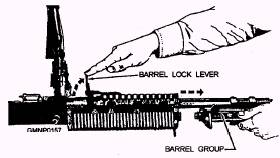 Figure 3-83.-Removing the barrel assembly. bolt to rotate until the locking lugs are in the vertical position. With the cam roller up, push the operating rod and bolt into the receiver until the end of the operating rod is even with the rear of the receiver. Insert the drive spring guide into the drive spring; then insert the opposite end of the drive spring in the recess of the operating rod, as shown in figure 3-84. Pull the trigger and push in the drive spring until the head of the guide is approximately an inch from the receiver (fig. 3-80). 4. Insert the buffer plunger into the drive spring guide, as shown in figure 3-80. Push forward on the buffer until the operating rod and bolt go fully forward. Push in on the buffer until the recesses on the buffer are aligned with the recesses in the receiver. Replace the buffer yoke from the top of the receiver, as shown in figure 3-79. 5. Align the guide rails of the stock with the guide rails on the receiver. Push forward until the stock is fully seated. A distinct click will be heard when the latch engages. 6. To check for correct assembly, pull the cocking handle to the rear and return it to its forward position. Close the cover and pull the trigger. The bolt should go forward. NOTE The bolt must be in the rear (cocked) position to close the cover. For further information on the M60 machine gun, refer to the Army's TM 9-1005-224-24 and TM 9-1005-24-10. |