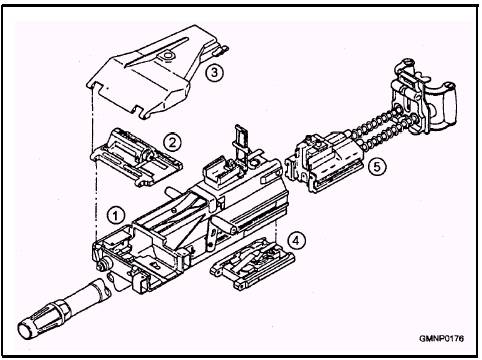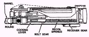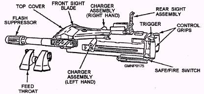 Figure 3-101.-Mk 19 Mod 3 machine gun. 3-50 light armor-piercing capability. It is an air-cooled, belt-fed, blowback-operated, fully automatic weapon. The Mk 19 Mod 3 machine gun is found on riverine craft and surface vessels that are tasked to operate in confined waters, such as the Persian Gulf. Major Components The Mk 19 Mod 3 machine gun has five major components, as shown in figure 3-102. These are the receiver assembly, the feed slide assembly and tray, the top cover assembly, the sear assembly, and the bolt and backplate assembly. RECEIVER ASSEMBLY.- The receiver assembly (fig. 3-102, 1) provides support for the other major assemblies of the weapon. FEED SLIDE ASSEMBLY AND TRAY.- The feed slide assembly and tray (fig. 3-102, 2) holds the rounds in the feeder and indexes ammunition into the firing position. TOP COVER ASSEMBLY.- The top cover assembly (fig. 3-102, 3) holds the feed slide assembly and tray. It is opened by a latch (left side) for loading or to clean and inspect the weapon. SEAR ASSEMBLY.- The sear assembly (fig.3-102, 4) holds the receiver sear. Trigger action depresses the sear, releasing the bolt and allowing the bolt to move forward for firing. The safety is attached to the sear assembly. When the safety slide is activated, it blocks the sear from being depressed by the operator as long as the safety is on S (SAFE). BOLT AND BACKPLATE ASSEMBLY.- Located on the bolt and backplate assembly (fig. 3-102, 5) is the handgrips and the trigger. When the trigger is depressed, it operates the sear assembly that releases the bolt for firing. The bolt is driven forward by a duel set of operating springs set around guide rods. Operational Sequence As described in the U.S. Army TM 9-1010-230-10, the operation of the Mk 19 Mod 3 machine gun can be broken down into three functions-loading/charging, firing, and recoil/ejecting. LOADING/CHARGING.- To begin operation of the Mk 19 Mod 3 machine gun with the weapon on SAFE and the bolt in the forward position, raise the topcover and load 40-mm ammunition into the feeder, as