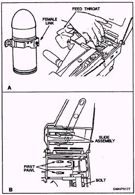 Figure 3-103.-Loading the Mk 19 Mod 3 machine gun. shown in figure 3-103. With the female link first, feed the belted 40-mm ammunition through the feed throat (fig. 3-103, view A) and into the feeder and across the first pawl (fig. 3-103, view B). Now, move the slide assembly to the left and close and latch the top cover. To charge the weapon, grasp the charger handles with palms down, as shown in figure 3-104, depress the charger handle leeks, and rotate the handles down. Then pull the charger handles sharply to the rear. When you