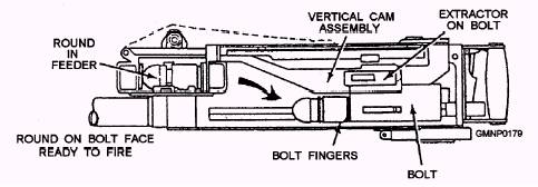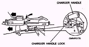 Figure 3-104.-Charging the Mk 19 Mod 3 machine gun. feel the bolt latch in the rear position, push the charger handles forward and up into the locked position. To load the first round, place the safety in the FIRE position and press the trigger. The bolt will spring forward and the first round will be loaded on the bolt face in the extractors. This is called the half-load position. Depress the charger handle locks and pull the charger handles to the rear a second time to load around into position for firing (full-load). Pulling the bolt back a second time (fig. 3-105) delinks the round from the belt. The curved rail on the vertical cam assembly forces the round down the bolt face, out of the extractors, and into the bolt fingers. FIRING.- With the weapon in the full-load condition, pressing the trigger causes the receiver sear to release the bolt. The recoil springs force the bolt forward (fig. 3-106). As the bolt travels forward, the cocking lever is released and the bolt sear strikes the receiver plate, pushing it rearward. This movement of the bolt sear releases the firing pin, which strikes the primer and fires the round. RECOIL/EJECTING.- As a round is fired, recoil pressure from the burning propellant acts to force the bolt rearward (fig. 3-107). As the bolt moves rearward,