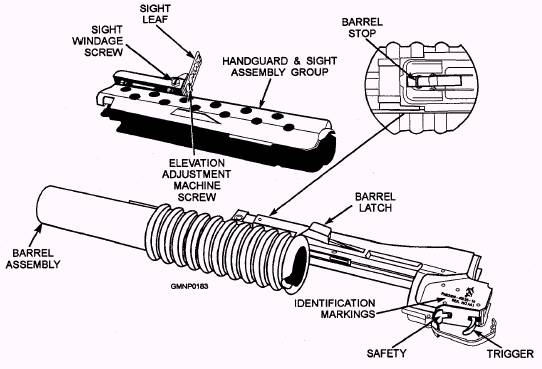 Figure 3-109.-40-mm grenade launcher, M203, controls and their identifications. forward movement, the barrel extension disengages from the cocking lever. The movement of the follower is restricted by the receiver; the follower holds the cocking lever in the DOWN position. When the barrel is moved rearward, the follower is driven rearward, the cocking lever again engages the barrel extension, and the firing pin moves slightly forward and engages the sear. The barrel stop (fig. 3-109) limits the forward motion of the barrel assembly. This prevents the barrel assembly from sliding off the receiver assembly barrel track during loading and cocking operations. When the barrel stop is depressed, it allows the barrel assembly to be removed from the receiver assembly for maintenance. Quadrant Sight Assembly The M203 has a quadrant sight assembly (fig. 3-110), which connects to the carrying handle of the M16 rifle. It consists of a sight arm, a range selection quadrant, and mounting brackets. The sight arm contains an aperture and post for sighting operations of the launcher. The range selection quadrant has embossed range graduations from 50 to 400 in 25-meter increments. The quadrant sight is used at ranges in excess of the 250 meters that is covered by the leaf sight. The 25-meter increments also allow for better accuracy at a greater number of range variations than the leaf sight. Barrel Assembly The barrel (refer to fig. 3-109) of the barrel assembly is constructed of specially treated and machined aluminum. The barrel extension is a rectangular, chrome-plated steel bar. It attaches to the barrel and provides a means of attaching the barrel to the receiver assembly. The handgrip is a molded plastic corrugated sleeve. When the grenade launcher is being fired, the plastic handgrip allows the Operator to hold the launcher without any discomfort from the heat. |