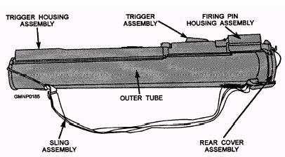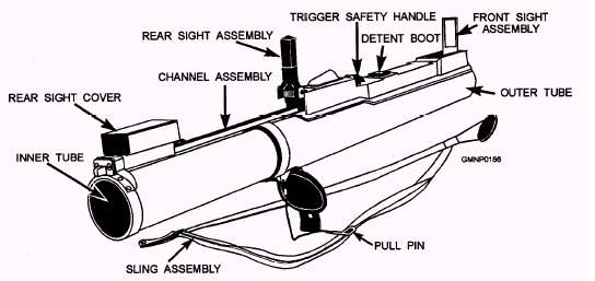 Figure 3-111.-M72A1 rocket launcher in CLOSED position. When the launcher is issued, it serves as a watertight packing container for the rocket (fig. 3-111); however, when the launcher is placed in the FIRING position fig. 3-112), it serves to ignite and guide the rocket on its initial flight toward the target. Once the launcher is fired, it is designed to be discarded. 81-MM MORTAR The 81-mm mortar (fig. 3-113) is a smooth-bore, muzzle-loaded, high-angle-of-fire weapon. It consists of a mortar barrel with a baseplug and a fixed firing pin for drop firing. The mount consists of a biped with traversing and elevating mechanism. A spring type of shock absorber absorbs the shock of recoil in firing. The baseplate is a unit that supports and aligns the mortar. For firing, the baseplug of the barrel is passed through the yoke of the biped mount, secured to the shock absorber and mounted into the baseplate. For transporting, disassemble the mortar into three groups: barrel, biped, and baseplate. A telescope sight, the M53, is provided for adjusting elevation and direction. The mortar can be hand carried as three separate one-man loads. The mortar is fired by inserting a complete round into the muzzle, fin assembly down. The elevation of the barrel causes the round to slide toward the base of the barrel. On reaching the base, a propelling charge on the round is ignited by the firing pin. The pressure of the gas produced by the burning propelling charge drives the round up and out of the barrel. The fin assembly stabilizes the round in flight. The mortar can deliver fire at ranges up to approximately 4,737 meters. The sustained and
