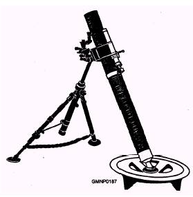 Figure 3-113.-The 81-mm mortar M29. maximum rates of fire are related to the type of round and charge being used. The complete mortar weighs 93 pounds. This includes the barrel (28 pounds), the biped (40 pounds), and the baseplate (25 pounds). The overall length is 51 inches and the maximum width is 21.6 inches. A variety of shells and fuzes have been developed to make the 8 l-mm mortar a versatile weapon. It can be used as either an offensive or a defensive weapon. |