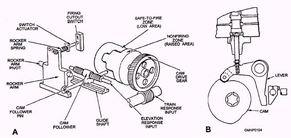 Figure 4-2.-A. A barrel cam used as a firing cutout device in a 5"/54 gun; B. An edge cam positioning a hydraulic valve. An edge cam is one that has the irregular surface machined around its outer edge. It may be stationary with the follower attached to a nearby moving component, or rotary. Edge cams are used to shift valves, to make or break switch contacts, and to position other mechanical devices. Figure 4-2 shows some of the uses of cams in ordnance equipment. |