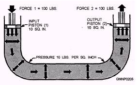 Figure 4-13--Force transmitted through fluid. A connection of any size, shape, or length will do, as shown in figure 4-14. The size of the line, however, will determine the volume of fluid flow, which, in turn, affects operating speed. In figures 4-13 and 4-14, the systems contain pistons with the same area. This makes the output force equal to the input force. Remember what we said earlier-the force applied is transmitted to all surfaces in the container equally. Now consider figure 4-15. The input piston is much smaller than the output piston. Assume the area of the input piston is 2 square inches. With a force of 20 pounds applied to it, a pressure of 10 pounds per square inch (psi) will be felt throughout the container, including the output piston. The upward force on the output piston is therefore 10 pounds for each of its 20 square inches, or 200 pounds. We have effectively multiplied the applied force. The system works the same in reverse. Consider piston (2) the input piston and piston (1) the output. The output force will be one tenth of the input force. You should now have a basic understanding of hydraulic principles. More information on hydraulic principles and theory can be found in the Navy training manual Fluid Power, NAVEDTRA 12964. This manual has a wealth of information that will be very useful to you as a Gunner's Mate. |