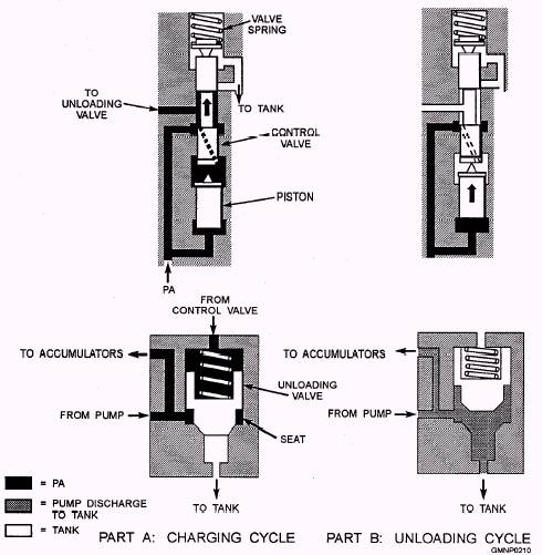 Pressure Regulators The control and unloading valves shown in figure 4-18 are used to regulate the operating pressure in an accumulator power drive system. The operating range of the fluid pressure for the functional description that follows is assumed to be 950 psi to 1,050 psi. The control valve and its piston maintain the operating range of the fluid pressure of the system by controlling the position of the unloading valve. The unloading valve (also called a bypass valve) is a three-way, plunger type of directional valve. Its function is to port the pump output to the accumulator during a charge cycle or to the tank (back to the reservoir) during an unloading cycle. During an accumulator charging cycle (fig. 4-18, part A), the spring holds the control valve in the DOWN position. A drilled hole through the lower land of the control valve ports system pressure (PA) from the accumulator to the chamber between the control valve and its piston. The' piston has PA applied to both ends and, therefore, does not affect operation of the control valve during this portion of the cycle. However, PA is only applied to the lower end of the control valve. The position of the control valve is determined by the amount of pressure in the accumulator system. As the pressure increases, the valve moves upward against spring pressure. During the charging cycle, PA is also ported from the upper chamber of the control valve to the spring-loaded (large area) side of the unloading valve. Pump output is also applied to the lower area around the seat (small area) of the unloading valve. The combination of spring pressure and PA on the large area keeps the unloading valve on its seat. In this position, fluid discharged by the pump is ported to the accumulator. As fluid pressure in the accumulator increases, it forces the control valve upward against its spring pressure. When the pressure reaches 1,050 psi, the lower land of the control valve blocks PA and the upper land uncovers the tank line (part B). This vents the
