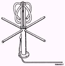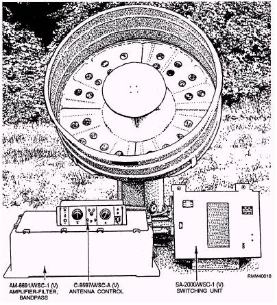 Figure 2-1.-OE-82C/WSC-1(V) antenna group. The AN/SRR-1 receiver system consists of up to four AS-2815/SSR- 1 antennas (figure 2-2) with an amplifier-converter, AM-6534/SSR-1, for each antenna. The antennas are used to receive satellite fleet broadcasts at frequencies of 240 to 315 MHz. The antenna and converters are mounted above deck so that at least one antenna is always in view of the satellite. The newer satellite systems use the SHF band. One of the major advantages of these systems is that they use a very small parabolic antenna measuring only 12 inches in diameter. A satellite antenna must be pointed at the satellite to communicate. We must first determine the azimuth (AZ) and elevation (EL) angles from a fixed location. Figure 2-3 illustrates how these angles are derived,