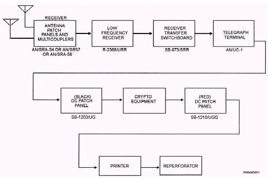 Figure 1-1.-Low-frequency receive system. (AF) to direct current (dc) for use by the teleprinter equipment. 5. Black dc Patch Panel- The dc output of the AN/UCC-1 is fed to the SB-1203/UG DC Patch Panel. The dc patch panel permits the signal to be patched to any cryptoequipment (discussed later) desired. 6. Cryptoequipment- The cryptoequipment decrypts the signal and connects its output to the red SB-1210/UGQ DC Patch Panel. 7. Red dc Patch Panel- The SB-1210/UGQ can be patched to a selected printer that prints the signal in plain readable text. |
