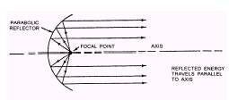 Figure 2-14.-Principle of parabolic reflection. antenna (normally a half wave) is placed at the "focal" point and radiates the signal back into a large reflecting surface (the dish). The effect is to transmit a very narrow beam of energy that is essentially unidirectional. Figure 2-15 shows a large, unidirectional parabolic antenna. Directional antennas are commonly used at shore installations. Wave Polarization Polarization of a radio wave is a major consideration in the efficient transmission and reception of radio signals. If a single-wire antenna is