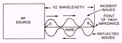 Figure 2-16.-AN/SRA-33 antenna multicoupler. consisting of four coupling units, with four SWR meters at the top (one for each coupler). To achieve a perfect standing wave ratio of 1:1 would mean that we have succeeded in tuning out all other impedances and that the antenna is matched perfectly to the transmitted frequency. With such a low SWR, the antenna would now offer only its characteristic impedance. A 1:1 SWR is rarely achieved, of course. There will always be some power loss between the transmitter and the antenna because of natural impedances that exist between the two. Nevertheless, the objective is to achieve the lowest SWR possible. In other words, we want only the characteristic impedance of the antenna remaining. Incident Waves Various factors in the antenna circuit affect the radiation of RF energy. When we energize or feed an antenna with an alternating current (ac) signal, waves of energy are created along the length of the antenna. These waves, which travel from a transmitter to the end of the antenna, are the incident waves. Let's look at figure 2-17. If we feed an ac signal at point A, energy waves will travel along the antenna until they reach the end (point B). Since the B end is free, an open circuit exists and the waves cannot travel farther. This is the point of high impedance. The energy waves bounce back (reflect) from this point of high impedance and travel toward the feed point, where they are again reflected. Reflected Waves We call the energy reflected back to the feed point the reflected wave. The resistance of the wire gradually decreases the energy of the waves in this back-and-forth motion (oscillation). However, each time the waves reach the feed point (point A of figure 2-17), they are reinforced by enough power to replace