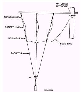 Figure 2-24.-Wire rope fan antenna. rope fans, whips, cages, dipoles, probes, trussed monopoles, and bow stubs. The selection and use of different types is often governed by the limited space available. WIRE ROPE ANTENNAS Wire rope antennas are installed aboard ship for medium- and high-frequency (300 kHz to 30 MHz) coverage. A wire rope antenna (figure 2-24) consists of