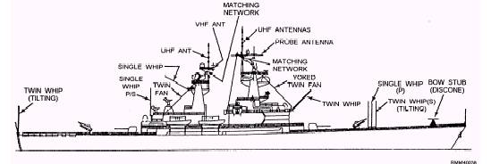 TYPES OF SHIPBOARD ANTENNAS Figure 2-23 shows various shipboard antennas and their placements. The complex structures of modern ships and their operational requirements require the use of many types of antenna. These types include wire