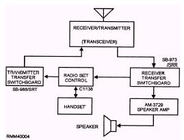 Figure 1-4.-Very-high-frequency transmit and receive system. VHF transmit and receive system using a transceiver. Although a transceiver is used in this system, the transmit and receive systems are described separately. Refer to figure 1-4 as we follow the signal path on the transmit side of the system. On the transmit side of the system, the operator, at a remote location: 1. Talks into the handset. 2. The handset is connected to the C-1138 Radio Set Control. 3. The output of the radio set control is sent to the transmitter transfer switchboard. 4. The output of the switchboard is sent to the transmit side of the transceiver. 5. The transceiver converts the input signal to an RF signal for radiation by the antenna. Continue to refer to figure 1-4 as we follow the path of the incoming signal. 1. The incoming signal in figure 1-4 is received by the antenna. 2. This signal is sent to the receive side of the transceiver. 3. The output of the transceiver is sent to the receiver transfer switchboard. 4. From the receiver transfer switchboard, the output is sent to either the C-1138 Radio Set Control or to a speaker amplifier, or both, depending on the preference of the user. 5. The output of the radio set control is sent to a handset. 6. A speaker receives the output of the speaker amplifier. |