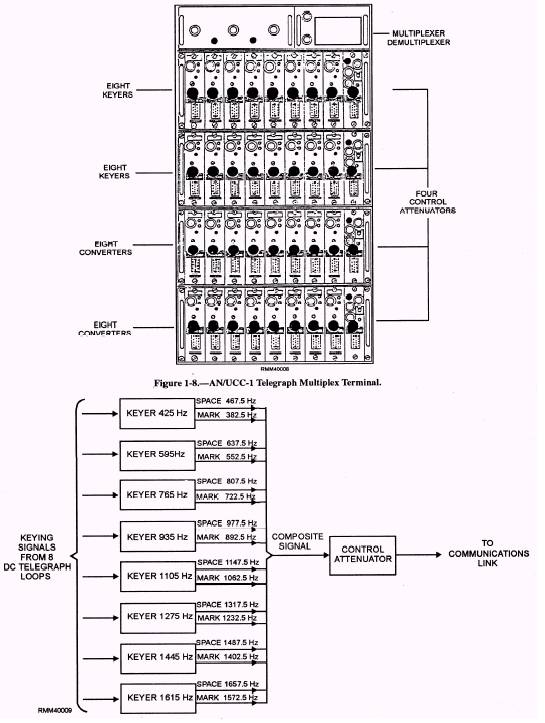CRYPTOGRAPHIC EQUIPMENT Some of the systems in the previous figures contained cryptographic equipment. Cryptographic equipment is only one of a number of the elements that make up a secure communications system. Though several different types of on-line cryptoequipments are in use throughout the naval communications system, they are all designed to perform the same basic function: to encipher and decipher teleprinter or digital data signals. Simply stated, the transmitter accepts a "plain text" teleprinter or data signal containing classified material from the classified patch panel (red). It then adds a "key," and relays the sum as "cipher text," or an enciphered signal. A key is a sequence of random binary bits used to initially set and periodically change permutations in cryptoequipment for decrypting electronic signals. Following this encryption, the signal is fed to the unclassified patch panel (black). Here, it is patched directly to the frequency-shift keyer or the multiplex equipment of the transmitter and converted into an audio signal. The audio signal, now in a form suitable for transmission, is routed to the transmitter via the transmitter transfer switchboard. On the receive side, the signal flow is quite similar to the send side in reverse order. The receiver accepts the enciphered signal from the black patch panel and generates a key to match the one generated by the transmitter. The receiver then subtracts the key from the cipher text input (which restores the plaintext teleprinter or data signal). Finally, it passes the signal on to the red patch panel for dissemination to the terminal equipment for printout. For further information and operator instructions on a specific type of cryptoequipment, refer to the applicable KAO publication. AN/UCC-1 TELEGRAPH MULTIPLEX TERMINAL Because of the traffic volume handled, many ships and shore stations require multiple teleprinter circuits on one sideband circuit. The method for increasing circuits on a sideband is called multiplexing. The Navy uses two multiplexing techniques in communications: time division and frequency division. The AN/UCC-1 Telegraph Multiplex Terminal uses the frequency-division technique. The AN/UCC-1 Telegraph Multiplex Terminal (figure 1-8) is a frequency-division multiplexed terminal equipment for use with single-sideband (SSB) or double-sideband (DSB) radio circuits, audio-frequency wire lines, or microwave circuits. The AN/UCC-1 is normally used afloat on a multichannel ship-shore full-period termination (discussed later). The following is an overview of how the AN/ UCC-1 works: At the transmitting station, the signals from the individual circuits, known as channels, are multiplexed into one composite signal for transmission. The transmission with the multiplexed channels is known as a tone package. At the receiving station, the composite signal (tone package) is demultiplexed (separated) into individual signals and distributed to separate teleprinters, as required. The terminal can operate in a nondiversity, audio-frequency diversity, space diversity, or radio-frequency diversity mode. Because of this versatility, the terminal is installed in various configurations throughout the Navy. Each electrical equipment cabinet houses one control attenuator (right side) and up to a maximum of eight frequency-shift keyers or eight frequency-shift converters. Since the control attenuator, keyers, and converters are solid-state, integrated-circuit, plug-in modules, the number of channels can be varied by increasing or decreasing the total number of modules. Depending upon the number of modules and the configuration used, the terminal can provide up to 16 narrowband channels. For example, if the terminal has keyers in the top cabinet and converters in the bottom cabinet, the system could transmit different information on eight channels. Each keyer would represent a channel on the transmit side and each converter, a channel on the receive side. Each frequency-shift keyer accepts a dc telegraph signal input from an external loop and generates the appropriate audio-frequency mark and space frequency-shift output. The individual keyers each contain two oscillators operating on opposite sides of a center frequency. For example, in figure 1-9, the center frequency of keyer number one is 425 Hz, the mark frequency is 382.5 Hz, and the space frequency is 467.5