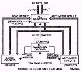 The control unit maintains order within the computer system and directs the flow of traffic (operations) and data. The flow of control is indicated by the dotted arrows on figure 1-1. The control unit selects one program statement at a time from the program storage area, interprets the statement, and sends the appropriate electronic impulses to the arithmetic-logic unit and storage section to cause them to carry out the instruction. The control unit does not perform the actual processing operations on the data. Specifically, the control unit manages the operations of the CPU, be it a single-chip microprocessor or a fill-size mainframe. Like a traffic director, it decides when to start and stop (control and timing), what to do (program instructions), where to keep information (memory), and with what devices to communicate (I/O). It controls the flow of all data entering and leaving the computer. It accomplishes this by communicating or interfacing with the arithmetic-logic unit, memory, and I/O areas. It provides the computer with the ability to function under program control. Depending on the design of the computer, the CPU can also have the capability to function under manual control through man/machine interfacing. The control unit consists of several basic logically defined areas. These logically defined areas work closely with each other. Timing in a computer regulates the flow of signals that control the operation of the computer. The instruction and control portion makes up the decision-making and memory-type functions. Addressing is the process of locating the operand (specific information) for a given operation. An interrupt is a break in the normal flow of operation of a computer (e.g., CTRL + ALT + DEL). Control memory is a random-access memory (RAM) consisting of addressable storage registers. Cache memory is a small, high-speed RAM buffer located between the CPU and main memory; it can increase the speed of the PC. Read-only memory (ROM) are chips with a set of software instructions supplied by the manufacturer built into them that enables the computer to perform its I/O operations. The control unit is also capable of shutting down the computer when the power supply detects abnormal conditions. ARITHMETIC-LOGIC UNIT The arithmetic-logic unit (ALU) performs all arithmetic operations (addition, subtraction, multiplication, and division) and logic operations. Logic operations test various conditions encountered during processing and allow for different actions to be taken based on the results. The data required to perform the arithmetic and logical functions are inputs from the designated CPU registers and operands. The ALU relies on basic items to perform its operations. These include number systems, data routing circuits (adders/subtracters), timing, instructions, operands, and registers. Figure 1-2 shows a representative block diagram of an ALU of a microcomputer. PRIMARY STORAGE (MAIN MEMORY) The primary storage section (also called internal storage, main storage, main memory, or just memory) serves four purposes: . To hold data transferred from an I/O device to the input storage area, where it remains until the computer is ready to process it. This is indicated by the solid arrow on figure 1-1. . To hold both the data being processed and the intermediate results of the arithmetic-logic operations. This is a working storage area within the storage section. It is sometimes referred to as a scratch pad memory. . To hold the processing results in an output storage area for transfer to an I/O device.