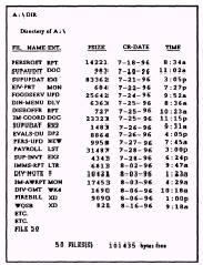 Figure 2-16.\Unstructured disk file directory. categories: files that deal with user applications and those that deal strictly with division matters. Using the tree-structured approach, you can divide your disk into smaller units by subdirectories, as shown in figure 2-17. In this example, E5 Christmas, as the primary user of these files, decided to organize her files by setting up a separate directory called E5CHRISTMAS. Within the E5CHRISTMAS directory, she set up several subdirectories. They are identified by <DIR> following the name and they have no extensions. Notice also that some files, those that relate to division matters, are included in the subdirectory along with the subdirectories that relate to user files. Because E5 Christmas uses the division files frequently, she wanted to be able to access them directly from her directory. Subdirectories, like other files, appear as entries in the directory; however, you can't see a listing (or a display) of all the files in all the subdirectories at one