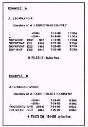 Figure 2-17.\Tree-structured disk file directory. time. Instead, you must look at each subdirectory to see what is in that one. If E5 Christmas wants to see what files are in the subdirectory SUPPLY, she would use the DOS command to change the directory name to SUPPLY and then display its directory (figure 2-18, example A). As the number of files on a disk increases, so does the need to have a disk that is well-organized. A well-organized disk can save you a considerable amount of time and frustration in locating files. As computer specialists, we know this is true and of great importance, but to the uninformed or new user who has not been properly trained, disk management may seem very cumbersome and time consuming. Some users may not even be aware that they can organize their files on disk, and that's where you come in. How can you help users create and use a tree-structured directory? you might ask. Whenever you format a disk, a single directory called a root directory is created. You can then instruct DOS to create or MaKe other DIRectories, using a command such as MKDIR or just plain MD. These are called subdirectories. Further, a subdirectory can have other subdirectories. Directories, regardless of their level, are given names just like any other files. DOS keeps track of each directory the same way it does your files. Using various DOS file handling commands, you can create (MKDIR or MD), change (CHDIR or CD), and remove (RMDIR or RD) directories and subdirectories. To move through the tree structure (UP or DOWN), you must issue commands that use a path name. A path name is a list of the directory(ies) (which might end with a file name) that DOS