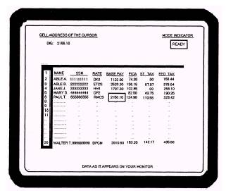 Figure 3-3.\Example of a spreadsheet/worksheet. Column\ A column is the vertical component of a spreadsheet. A record (or row) can have many associated columns, such as base pay, FICA, state tax, federal tax, and so on. Each column contains one type of information and is normally labeled to identify the type it contains, such as base pay. The columns are usually identified by letters (A, B, C, D, and so on). Data cell\ A data cell contains one piece of information associated with a particular record. Thus, a record/row that contains seven pieces of information will have\you guessed it\seven data cells. A data cell is symbolically identified by using some type of common notation-usually column, row. Therefore, if you have a spreadsheet with 20 records, each with 7 columns of information, the rows will be numbered from 1 through 20, and the 7 columns will be identified by the letters A through G. In this way, the fourth column, sixth row of the spreadsheet will be data cell D6, which, in figure 3-3, contains the value 2156.10. The entire collection of data cells is often referred to as a matrix or an array. When entering data, it is not necessary to enter it in alphabetical or numerical order; the software package will normally arrange the data in whatever sequence you desire. In looking at figure 3-3, you will notice each individual has only one record, and each record/row contains seven columns (or data cells) of information. There could have just as easily been 20, 50, or 75 columns of information per record. The number of data cells is limited only by the parameters of the spreadsheet software and by the amount of available RAM. To give you some idea of a spreadsheet's size, the worksheet you see in figure 3-3 might be only a small portion of the entire worksheet\the amount that can be displayed at one time. Although there appear to be only 20 rows and 7 columns of information, depending upon the software package you are using, it could conceivably contain up to as many as 8,192 rows and 256 columns of information totaling more than 2 million data cells. A spreadsheet of this size would be equivalent to a piece of paper approximately 21 feet wide by 130 feet long. Try spreading that out on a table! Interacting with Spreadsheet Software Like other software packages, you have cursor movement keys, function keys, and commands to tell the software what to do. The following list contains some of the more common ways you can expect to interact with a spreadsheet software package: l Cursor movement (or arrow) keys\ You can move the cursor one cell at a time in one of four directions\up, down, left, or right. Other keys such as PgUp and PgDn move the cursor up or down one full page; still others, when used in conjunction with other keys, move the entire worksheet in a specific direction. l Function keys\ You can use F1, F2, F3, and so on, to display HELP screens, edit entries, display range names, enter absolute formulas, move back and forth between screens or windows, perform range and global recalculations, and so on. l Spreadsheet commands\ You can use commands to tell the software what to do. Features of Spreadsheet Software Spreadsheet software packages normally include ways to do the following things: l Enter labels (non-numeric data). l Enter values (numeric data). l Enter formulas (to perform calculations, analyses, comparisons, and projections). l Insert and delete columns and rows. l Copy and move ranges of data cells/records from one area of a worksheet to another. l Erase part or all of a worksheet. l Change the way values are represented on part or all of a worksheet. l Split the viewing screen to allow you to view two parts of a worksheet simultaneously. l Save, retrieve, rename, erase, and copy files. l Print a worksheet. Figure 3-4 is an example of a printed spreadsheet showing the labels and titles, along with the values you entered (shown in italics), and the values calculated by the computer (shown in bold). Notice all the totals and subtotals were calculated by the computer. By using spreadsheet software, you need only enter a new price