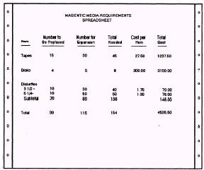 Figure 3-4.\Examp1e of a printed spreadsheet. when the price changes and direct the computer to recalculate the totals/subtotals. Many of the available spreadsheet software packages will interact directly with other programs such as database and word processing applications. Some spreadsheet packages integrate (or combine) several programs into one, such as a spreadsheet program, a graphics program, and a database management program. |