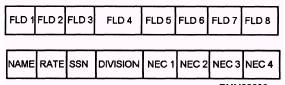 Figure 3-5.\Example of a database record. the database for the records that meet the criteria (SKI or SK2, Supply Department, and NEC 1234). The computer then displays or prints the requested information in the format specified. See figure 3-6. You do this through the query and report features of the database package. Doesn't that beat manually searching through a drawer full of folders, which could take hours? A database is nothing more than a collection of data\many file folders or individual records containing several fields or data elements. The database is organized to allow you to retrieve, update, and have ready access to various information that can be formatted and printed as you desire. The database itself doesn't do anything; it just holds information. |
