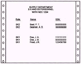 Figure 3-6.\Example of a database report. Field\ A field consists of one unit of information. A field is also referred to as a data item or a data element. It maybe alphabetic, like your name (John or Jane Doe); numeric, like your ZIP Code (01234); alphanumeric, like your post office box or street address (P. O. Box 669 or 1234 Main St.); or logical (true/false), like on leave (true-on leave, false-not on leave). Pointer\ A pointer is a data item in one record that identifies the storage location of another logically related record. Index\ An index enables you to access records in a database (also referred to as database file or file) in the order of the index regardless of the physical sequence of the records in the database. You can think of indexing as sorting without having to sort. The index itself is a file. It contains a duplicate of the key field (or fields) such as account number, or name and security number, and a pointer to the actual disk record identified with this key in another permanent disk file. For example, if there are 5,000 records in your database, and the key field happens to be SSN, then the index would also contain 5,000 entries with each entry having an SSN. It is also possible for you to have one or more secondary indexes that contain other various secondary key fields. Primary key\ The primary key in a database consists of a unique identifier for a particular record and should only point to a single record in the database being indexed. Secondary key\ Data are normally arranged within a database in some type of order, depending upon the contents of one or more fields. Secondary keys allow you to access the database in different ways. For example, your database might be arranged in the order the records were entered. You can then set up a secondary index (or key) by the name field, or by the social security number field. You may specify any number of secondary keys. You might index by more than one field. For example, you could index by last name within rate, as shown in figure 3-6. Database Organization Methods/Structures Databases can be list, hierarchical, network, or relational in structure. The major advantage of a database is it permits the maintenance of a related set of files or tables that can provide information to several different users. So how do these database structures differ? you might ask. That's a good question. Read on and find out. LIST DATABASES.\ List databases link records together through the use of pointers. The pointer is a data element in one record (normally the master record) that points to the actual disk location of another logically related record, as illustrated in figure 3-7. HIERARCHICAL DATABASES.\ Hierarchical databases consist of elements that act in a superior-subordinate or parent-child relationship. What this means is that one element is linked to another element in the database. The superior element points to one or more subordinate elements. There can also be a subordinate of a subordinate, which will enable many hundreds of elements to be connected. See figure 3-8. |