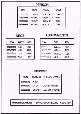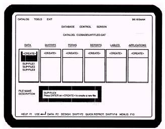 Figure 3-10.\Example of a relational database structure. l Create and run forms and reports, design and print labels. l Query the database for information. l Create and run/execute applications programs. l Import and export files. You can use function keys F1, F2, and so on, to provide help screens, to display lists of items, to design database files, queries, reports, forms, and labels; to add fields to a layout, to move or copy selected data, to enlarge/shrink fields or condition boxes, to print a quick report, to access menus for the current screen, to access macros, and so on. Some database packages provide you with some type of control screen like the one shown in figure 3-11. Using a control screen allows you to access a number of features. This particular control screen has six panels, each corresponding to a different type of operation on your database. Displayed across the top left-hand corner of the control screen you see three main menus\ Catalog, Tools, and Exit. Catalog provides you with options for managing catalogs and the files contained in them. A catalog is a file in itself that contains the names of related files. Tools provide you with a variety of utilities for accessing the disk operating system (DOS), for importing and exporting files, and for setting program parameters. Exit enables you to leave the control screen and go back to the disk operating system.