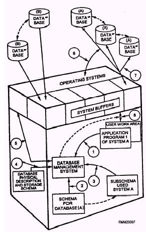 Figure 3-15.\A conceptual view of the events that take place when an application program reads a record in a system interfaced with a DBMS. program of a particular software system reading a record. It is intended as a conceptual training aid for instructional purposes only. The numbered arrows in figure 3-15 trace a call for data by application Program 1 of System A. (Calls for data by other programs maybe handled concurrently by the DBMS, but this is not depicted in the figure.) The following events (numbered to correspond with figure 3-15) take place, depending on the software system in use, when a program attempts to read a record: 1. DML Program 1 of System A makes a call for data from Database (A) to the DBMS. 2. The DBMS analyzes the call and supplements the arguments provided in the call itself with information provided by the schema for Database (A), \ and the subschema referenced by Program 1. 3. The DBMS obtains the subschema used for System A and retrieves the description of the data in question. 4. The DBMS examines the database physical description and keys the actual physical record to read. 5. On the basis of the call for its services and the information obtained from the schema and subschema, the DBMS requests physical I/O operations, as required to execute the call, from the operating system. 6. The operating system (OS) interacts with the storage media containing the database. 7. The operating system then delivers the requested data from the actual database to the system buffers. 8. The DBMS transfers data, as required to fulfill the call, between the system buffers and the user work area (UWA) of Program 1, which originated the call. Any required data transformations between the representation of the data as it appears in the database (as declared in the schema) and the representation of the data as it appears in a program's UWA (as declared by the subschema) are handled by the DBMS. The DBMS provides status information to program 1 based on the outcome of its call, for example, error indications. The data in Program 1's UWA may be manipulated as required, using the facilities in the host language. The system buffers are shared by all programs serviced by the DBMS. Remember, programs interact with the system buffers entirely through the DBMS. |